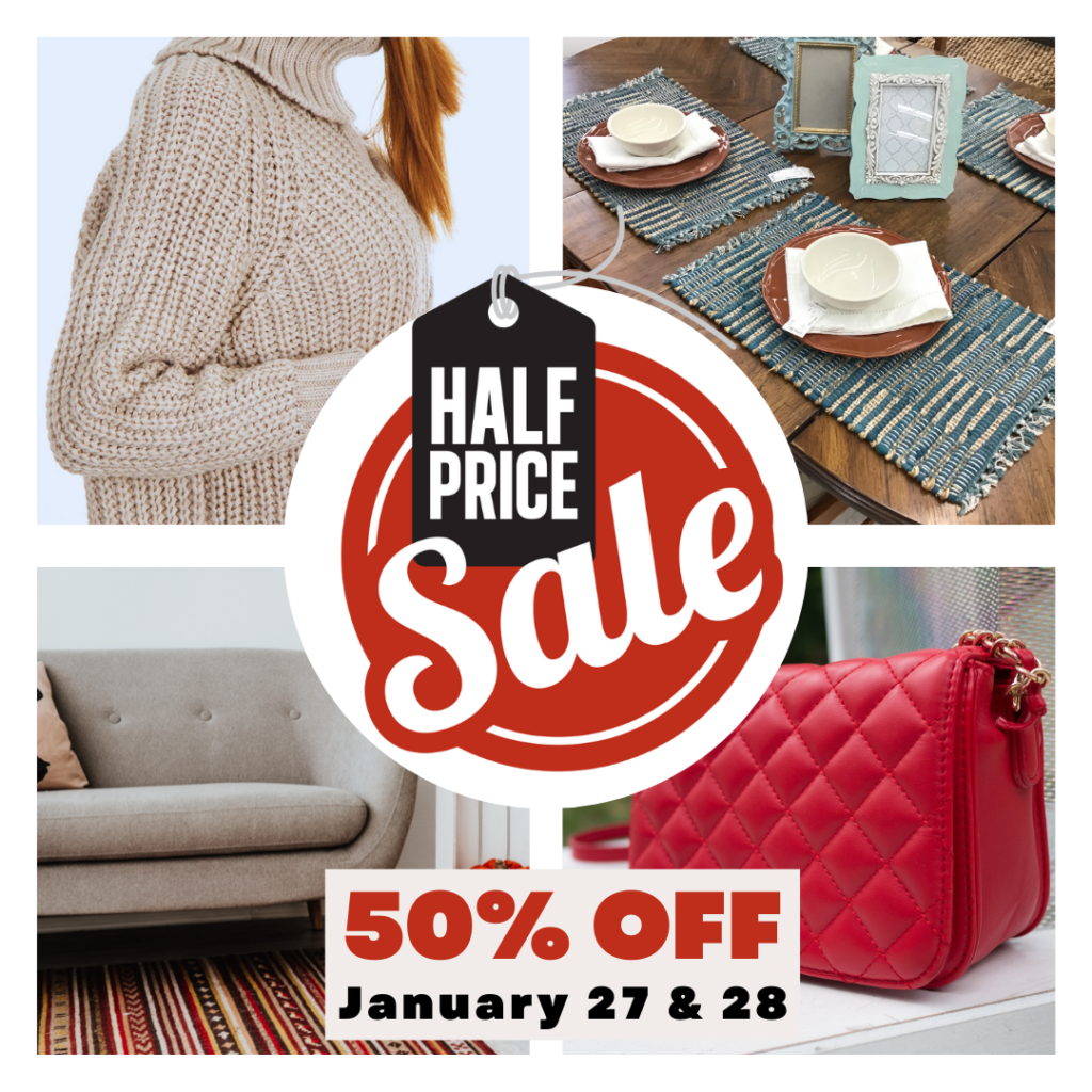 Don’t miss out on the shopping event that everyone is talking about. Join us January 27 & 28 for Stuff Etc’s 1/2 Price Sale. A weekend of savings, style, and giving back to the community. See you there!